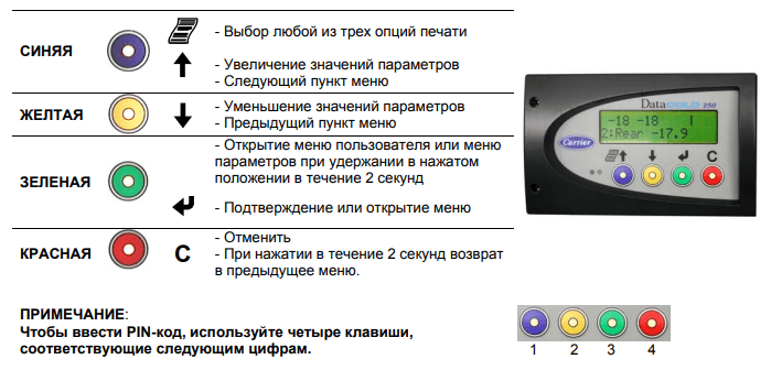 Панель управления Carrier DataCOLD 250 T/R состоит из трех основных частей: