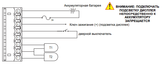 Обычно подсветка дисплея включается после нажатия любой клавиши и автоматически выключается через 20 секунд. Если при движении требуется постоянная подсветка дисплея, подключите штыревой контакт 6 к + цепи ключа зажигания автомобиля.
